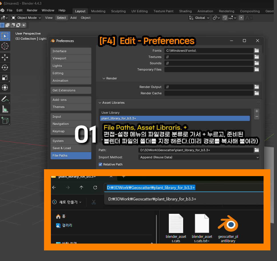 에셋라이브러리는 자산도서관이란 뜻입니다. 편접-설정 메뉴의 파일경로 분류로 가서 + 누르고, 자주사용하고 가치있는 모델링 소스들이 모여있는 저장된 블렌더 파일의 폴더를 지정 해줍니다. 미리 경로를 복사해 붙여 연결을 시켜줍니다. 연결된 파일은 필수로 삭제없이 말 그대로 도서관으로 지정된 곳에서 새로 만들기한 블렌더 새문서에 다양한 소스들을 찾아 적용시킬 수 있는 도서관역할을 하는 것입니다.
