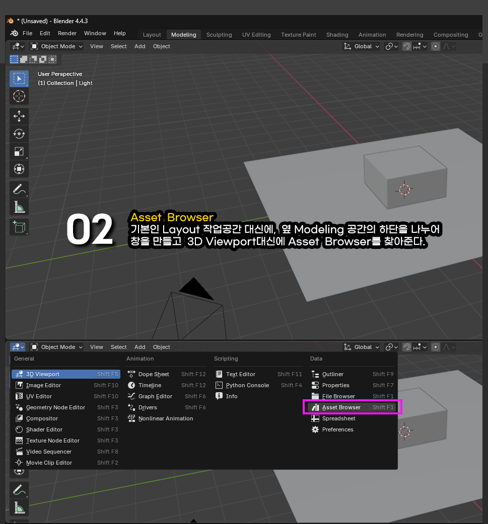 Asset Browser를 볼 수 있는 공간이 필요합니다. 기본인 Layout는 애니메이션 등 다양한 업무를 하는 곳이라 작업공간 그 대신에, 오른족 Modeling 공간의 하단을 나누어 창을 만들고 3D Viewport대신에 Asset Browser를 찾아 줍니다.