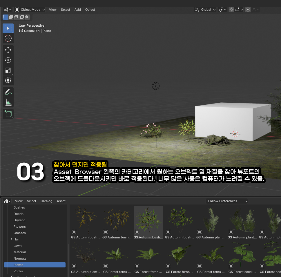 Asset Browser 왼쪽의 카테고리에서 원하는 오브젝트 및 재질을 찾아 뷰포트의 오브젝트에 드롭다운 시키면 바로 아래 그림처럼 추가되어 적용됩니다. 면의 수가 많은 하이폴리 모델링 오브젝트가 너무 많은 경우에은 컴퓨터가 느려질 수 있으니 유의 하세요.