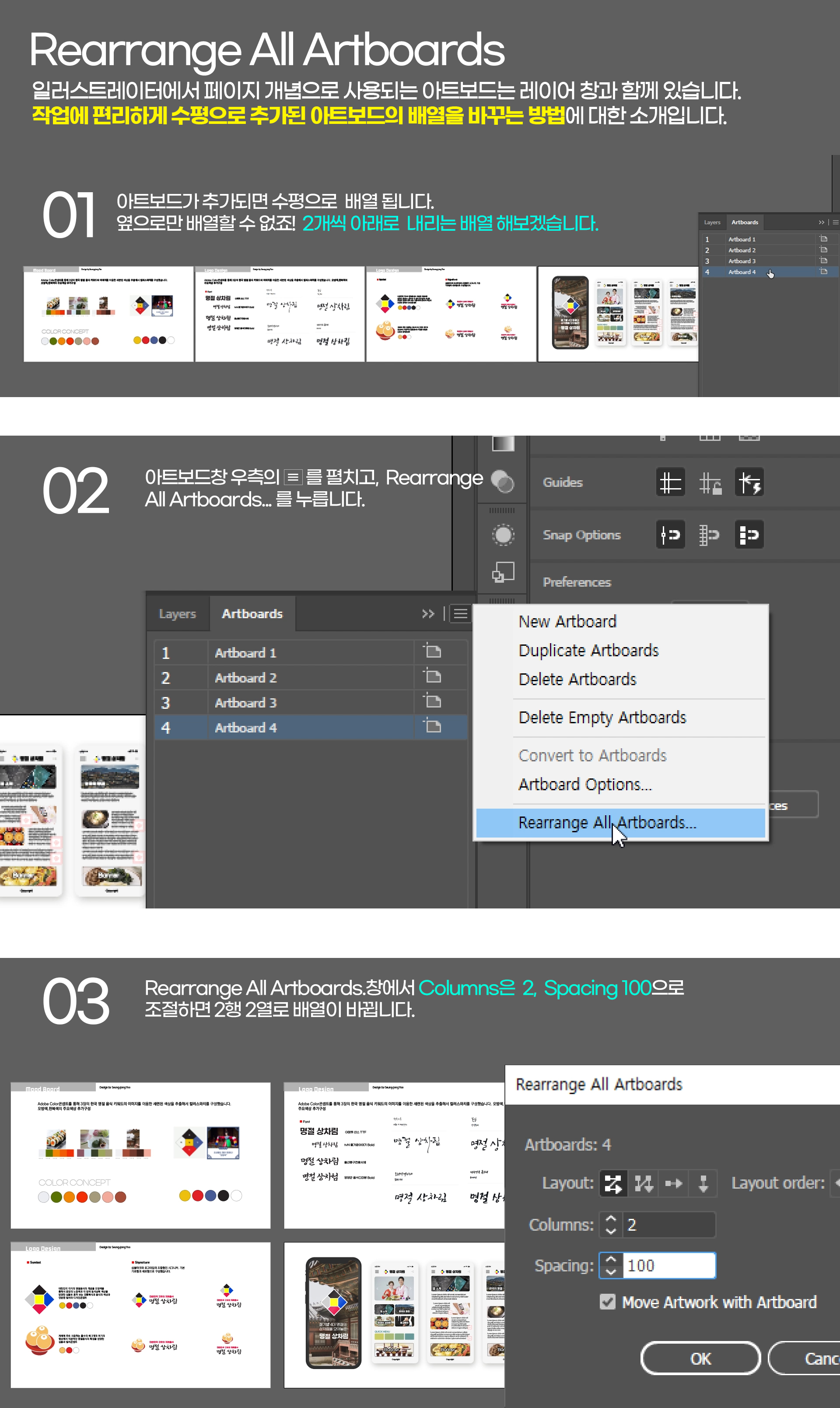 포토샵, 프리미어 프로, 애프터이펙트에 벡터 그림을 제공하는 일러스트레이터에서 특정한 규격으로 만든 새 문서으 크기를 아트보드라고 합니다. 일러스트레이터에서 페이지 개념으로도 사용되는 아트보드는 F7키를 누르면 레이어창과 함께 있습니다. 아래는 작업에 편리하게 수평으로 추가된 아트보드의 배열을 바꾸는 방법에 대한 소개입니다.