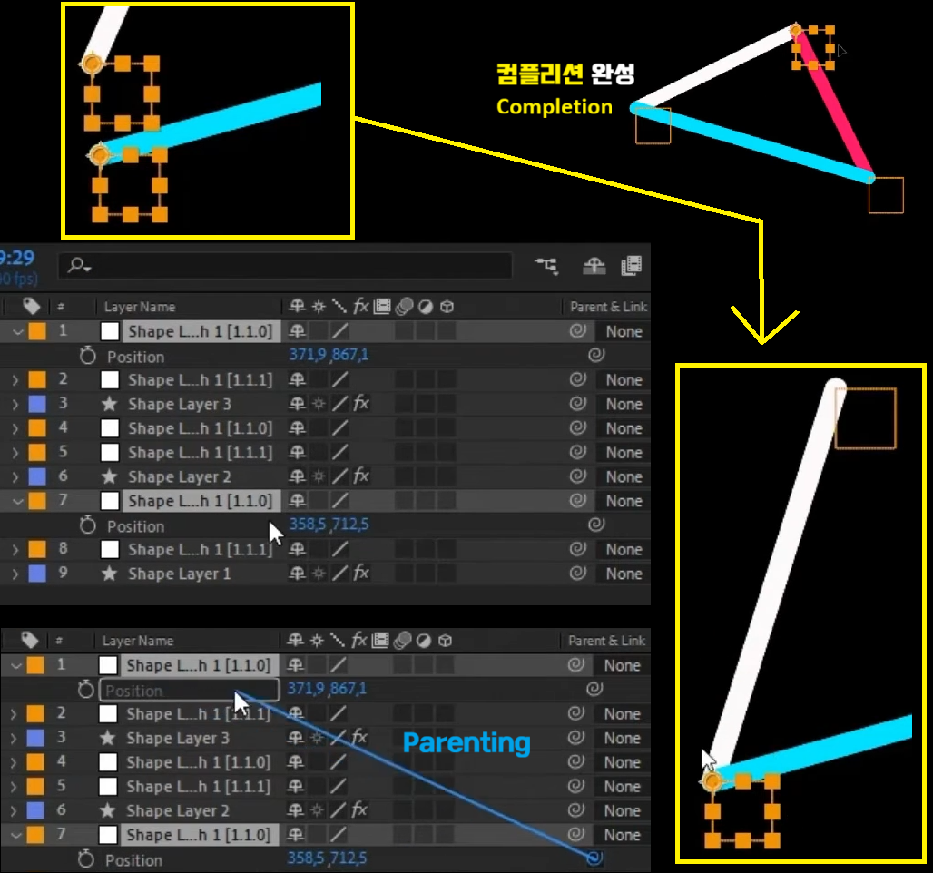 03. 추가된 Null중 특정한 Null에 Point를 일치시키는 작업이 필요한데, 2개의 Null을 선택하고 P키를 눌러서 Position속성만 보이게 한 후에 그림과 같이 Parenting을 해줍니다. 고정된 하나의 Null을 부모로해서 Child가 따라다니는 모션그래픽을 표현할 수 있습니다. 이제 조금 정리하는 부분이니 조금만 참고 따라합니다.
