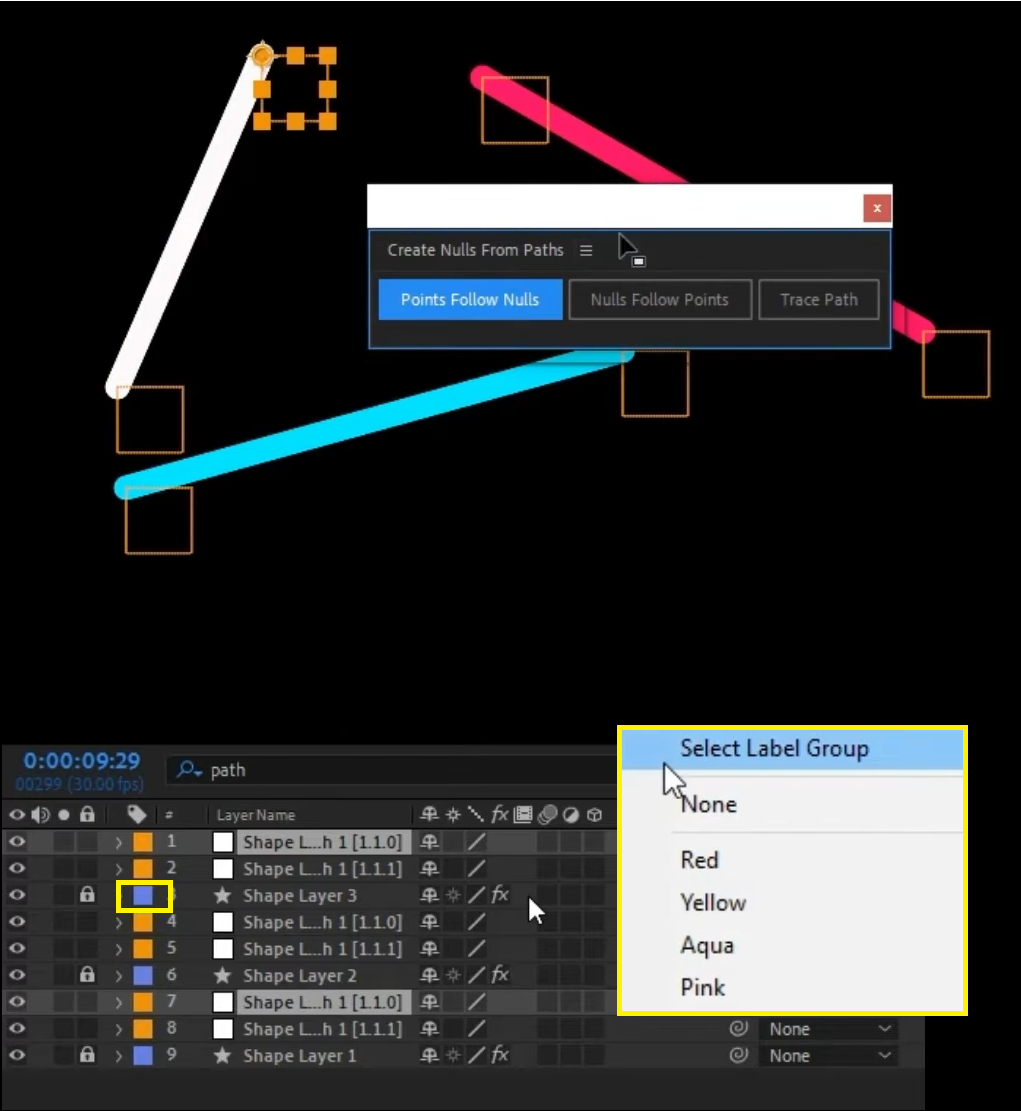 02. Create Nulls From Path.jsx를 누르면 뜨는 창에서 Points Follow Nulls라는 버튼을 누르면 Null들이 선택된 Path의 끝 Point에 하나씩 추가된다. 각 Shape 위에 2개의 Null들이 추가되어 있어 복잡해서, 레이어의 색상부분을 누르고 Select Label Group을 누르면 동일한 색상그룹이 선택되고 자물쇠버튼을 눌러서 잠귀준다. 여러 레이어들이 있는 경우 방해되지 않게 선택해서 잠그는 방법으로 알고 있으면 좋겠다.