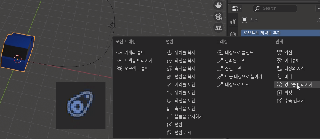 03. 오브젝트 제약 속성창에서 '오브젝트 제약을 추가'를 누르고 '경로를 따라가기(Follow path)'를 추가한다.