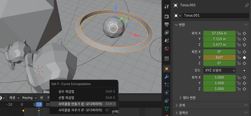 링 형태가 된 토러스의 Y축의 변환을 2개의 키프레임으로 0~360도로 일정한 10간격으로 키프레임을 생성했습니다.