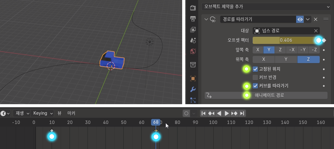 04. 제약내용에서 녹색형광빛의 순서대로 고정위차, 커브따라가기, 애니메이트경로를 체크하고 오프셋 팩터의 0에서 부터 필요한 스토리에 따라 변화를 주며 키프레임을 생성한다.