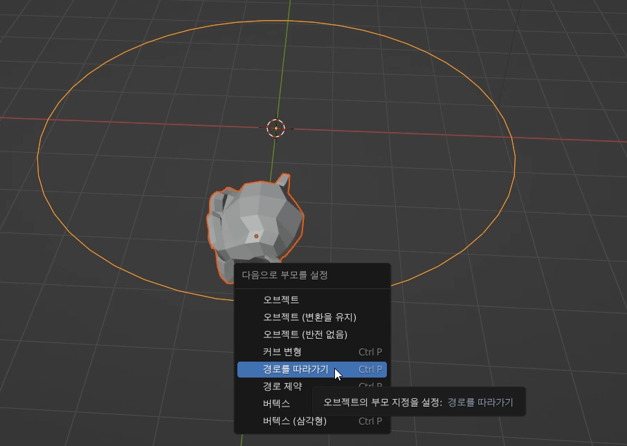 3. 지금 부터는 순서가 중요합니다. 수잔을 선택하고 Shift를 누르면서 커브를 선택해주세요. 그 다음으로 콘트롤 P .. C+P를 누르고 뜬 다음으로 부모를 설정창에서 경로를 따라가기를 선택 해줍니다.