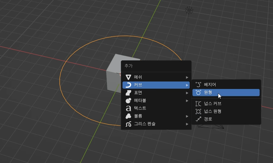 1. 수잔 원숭이가 있는 현재 스테이지에서, 추가(Shift+A)를 누르고 커브 - 원형을 클릭해서 원을 그려주세요. 필요한 경우 S를 누르고 크기를 조절하세요.