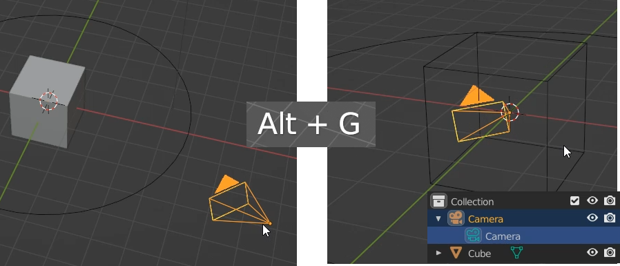 02. 카메라를 선택한 후 Alt+G를 누르면 현재 스테이지의 중앙의 원점에 위치한다. 이때는 카메라가 안보이는 것처럼 보이는데, 와이어프레임 보기에서 보면 카메라가 감춰진 것을 확인 할 수 있다.