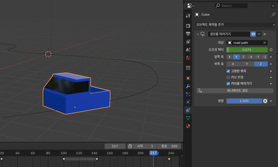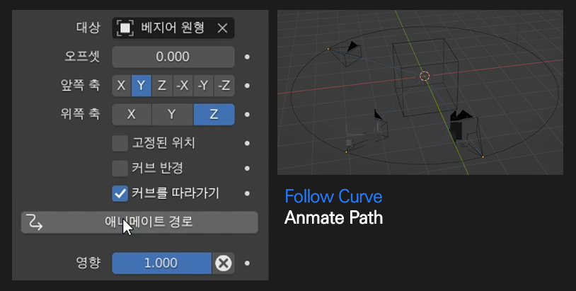 06. 이제 경로 애니메이션 처리를 위해 스크롤바를 올리고 먼저 추가한 '경로를 따라가기(Follow path)'에서 커브를 따라가기(Follow Curve)를 체크하고 애니메이트 경로(Animate Path)버튼을 누르면 애니메이션이 전개되는 것을 확인 할 수 있다.